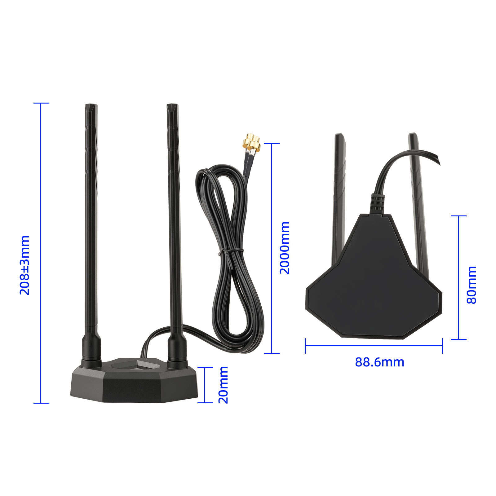 Type: WiFi Antenna Center Frequency: 2400-2500 MHz /5150-5850MHz/5900-7125MHz Connector Gender: Male Impedance: 50 Ohms Nominal Gain: 6.0dBi V.S.W.R: <2.0 Cable Length: 2M