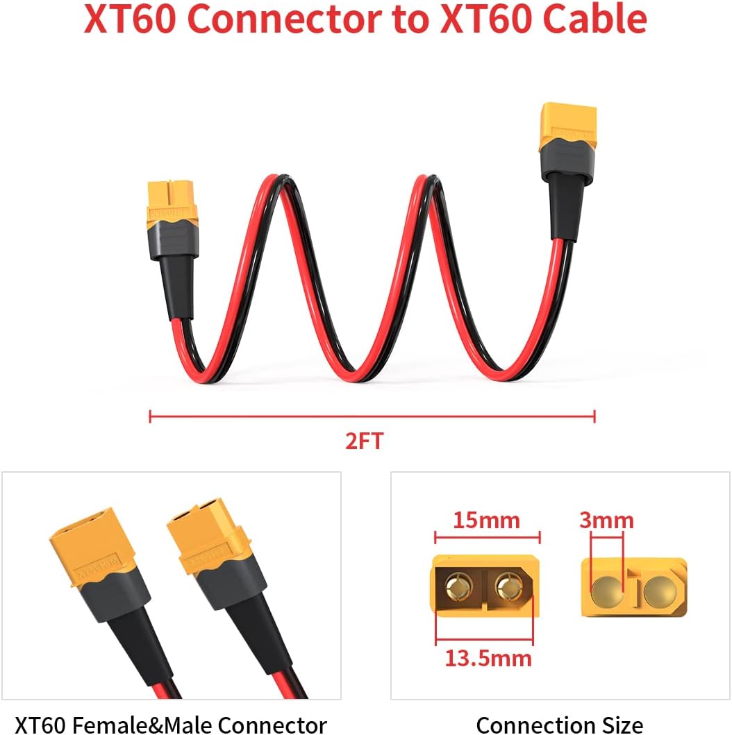 • [You Will Get] 1*10AWG 2FT XT60 Extension Cable & 24 months friendly customer servic. Please contact us if you have any issue, we will reply and solve within 24 hours. (Note: Before Using Please Make Sure the Positive and Negative Poles are Correctly Matched)