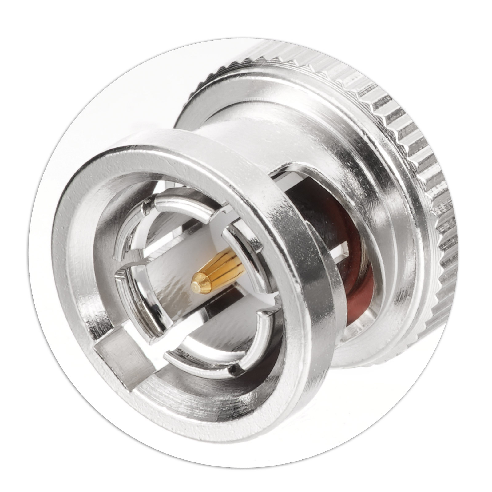 BNC connectors are made of copper nickel plating. The inner needle is copper plated with gold. Precision-made connectors ensure long-lasting quality.