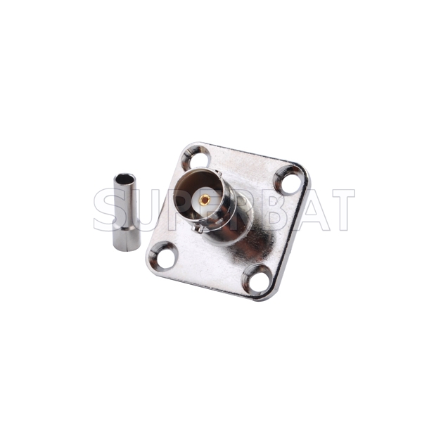 Series: BNC Termination Type: Coaxial Cable Gender: Jack , Female Polarity: Standard Interface Type: RG174 , RG316 Body Style: Straight Mount Method: 4 Hole Flange Impedance: 50 Attachment Method: Crimp Body Material: Brass Body Plating: Nickel Frequency Range: DC-3GHz